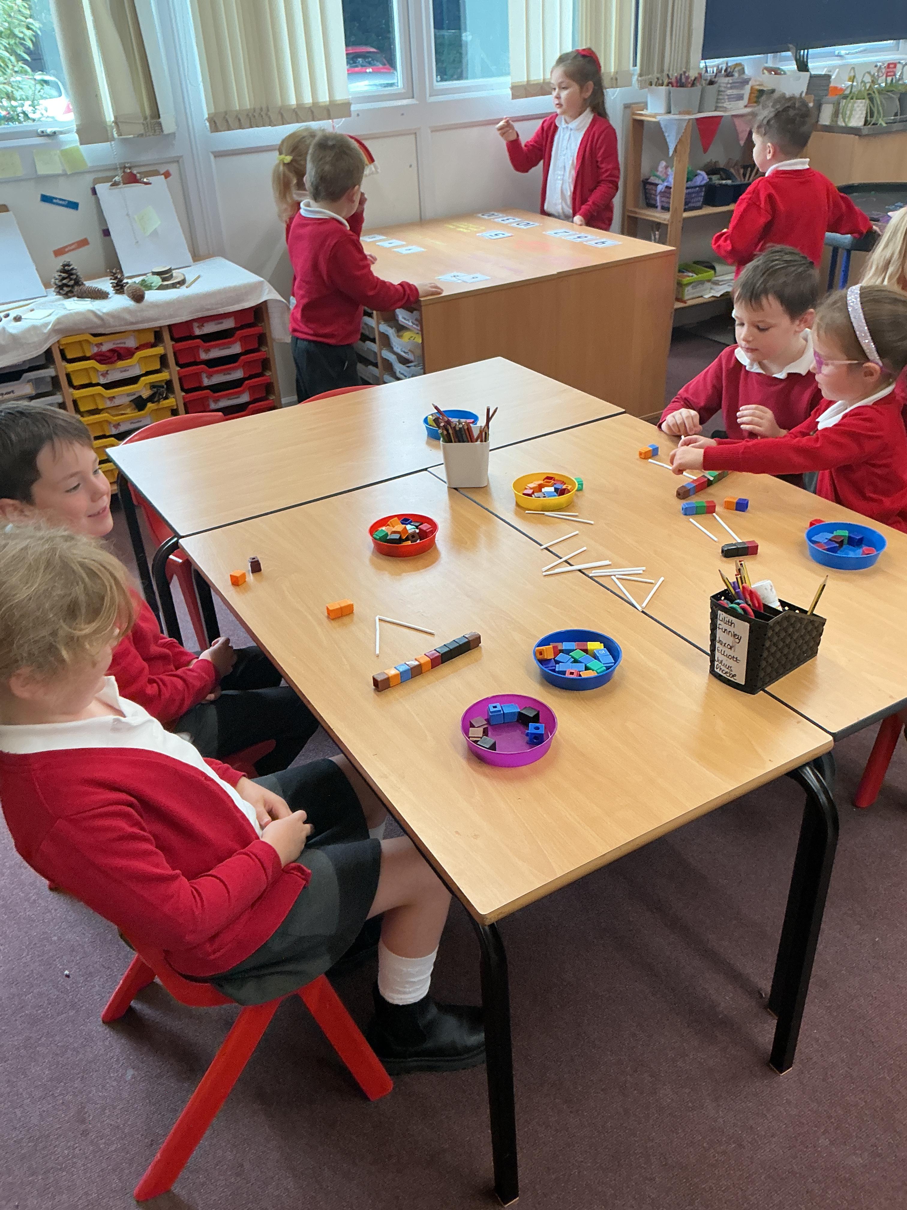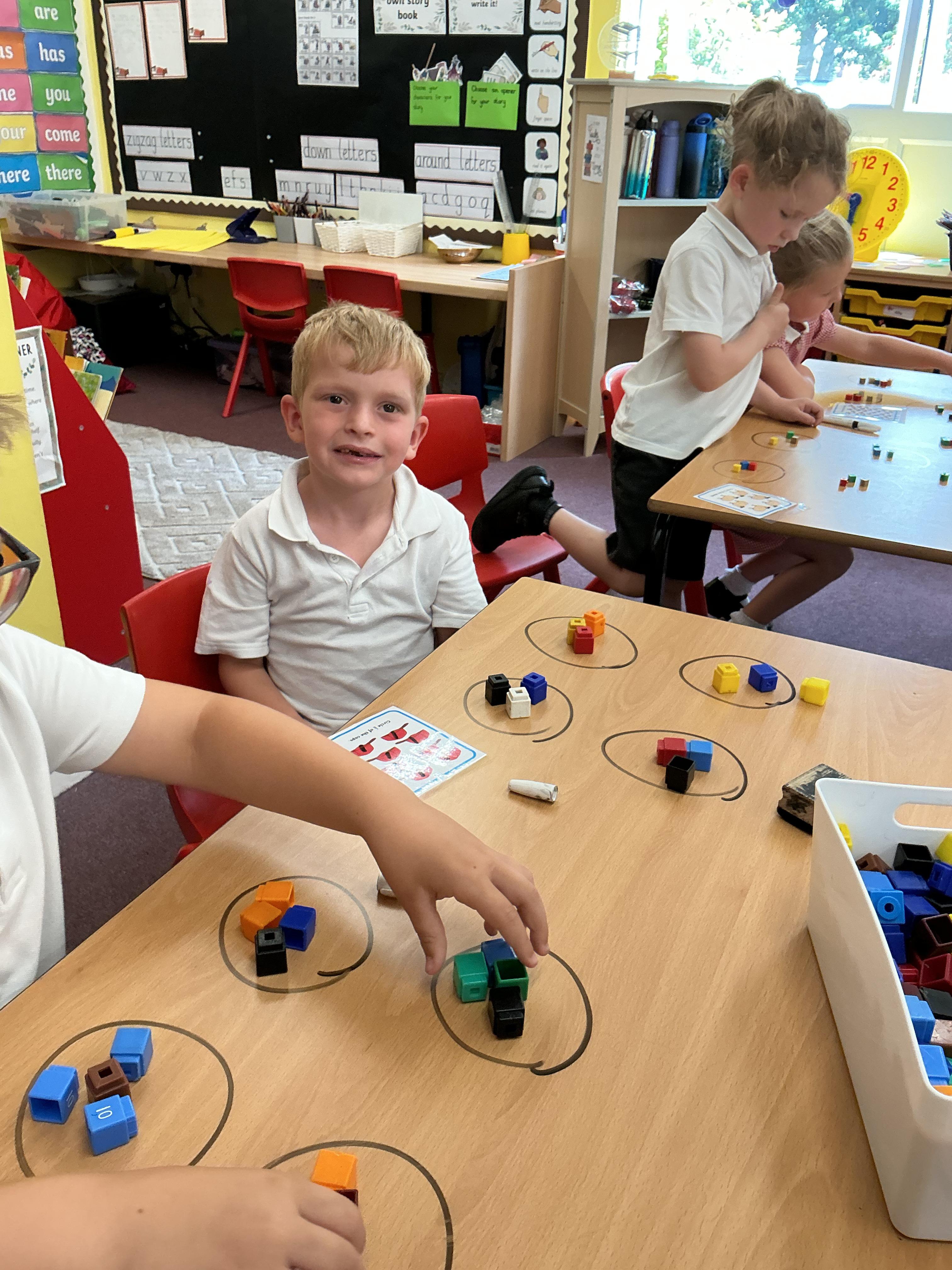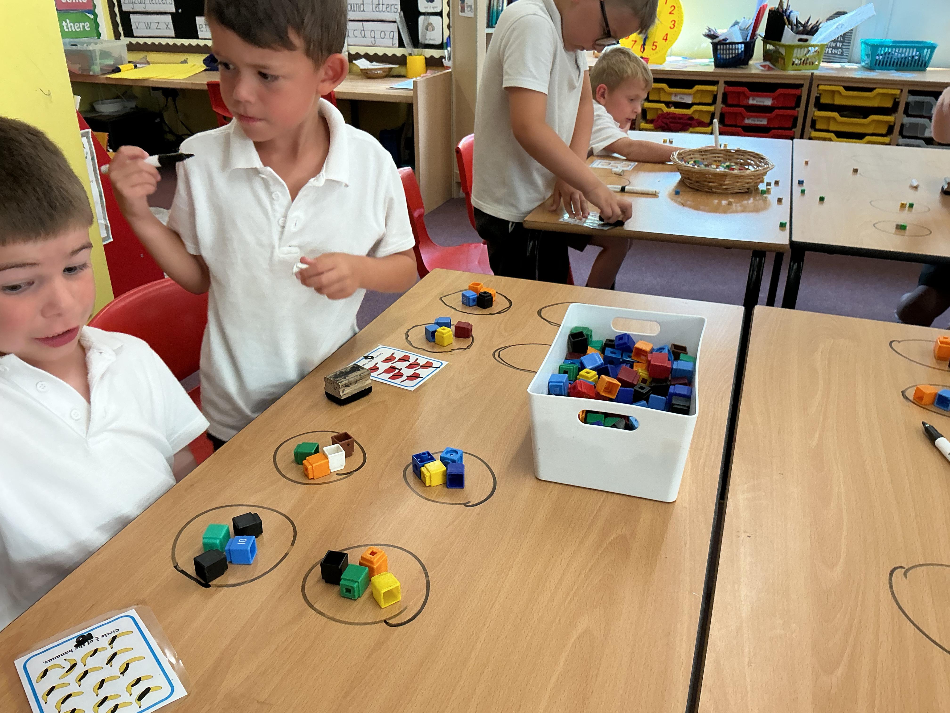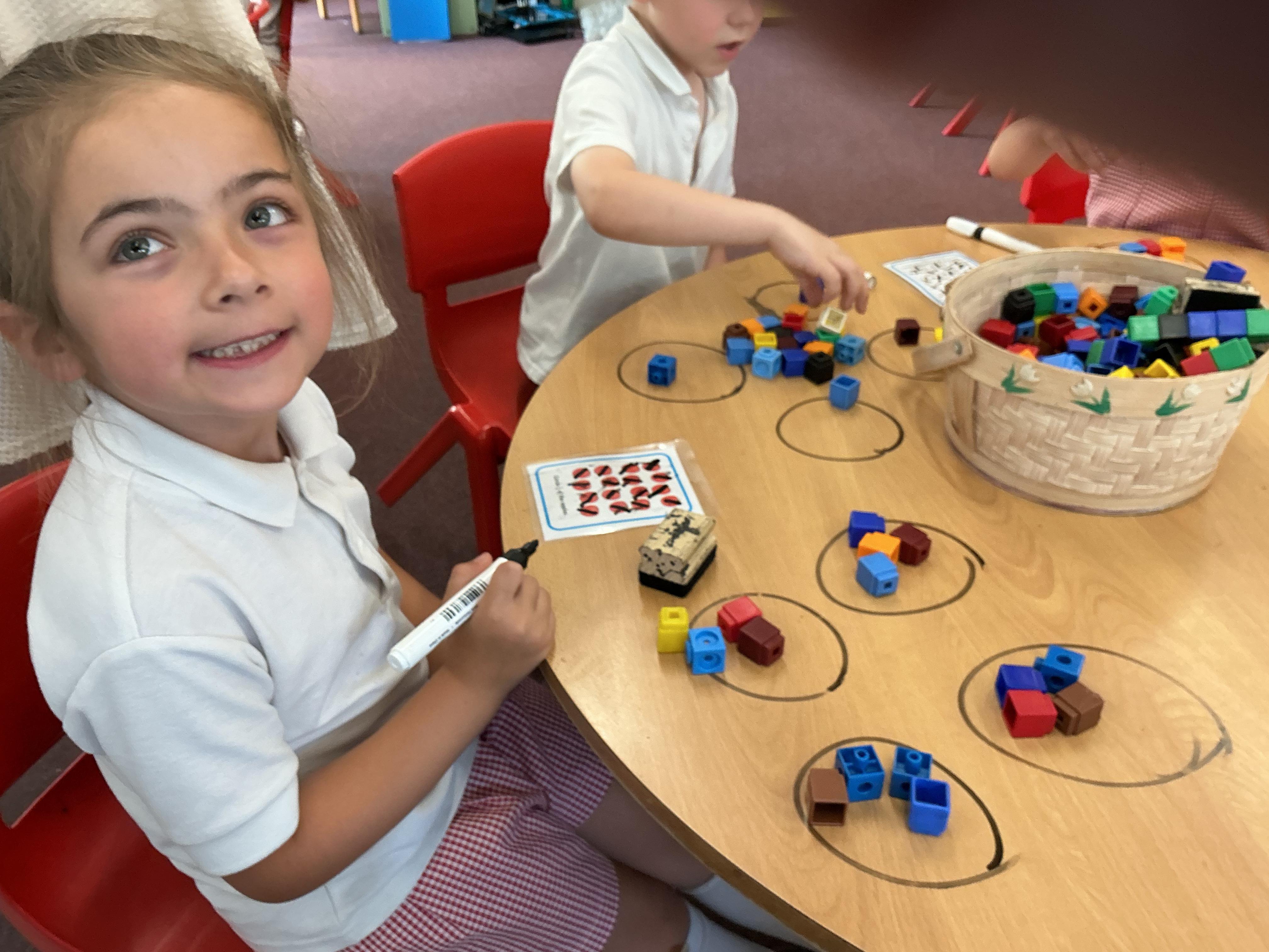 We have been using equipment to help us find halves and quarters of groups of objects. We even wrote on the tables to help us with our learning - luckily it all came off!