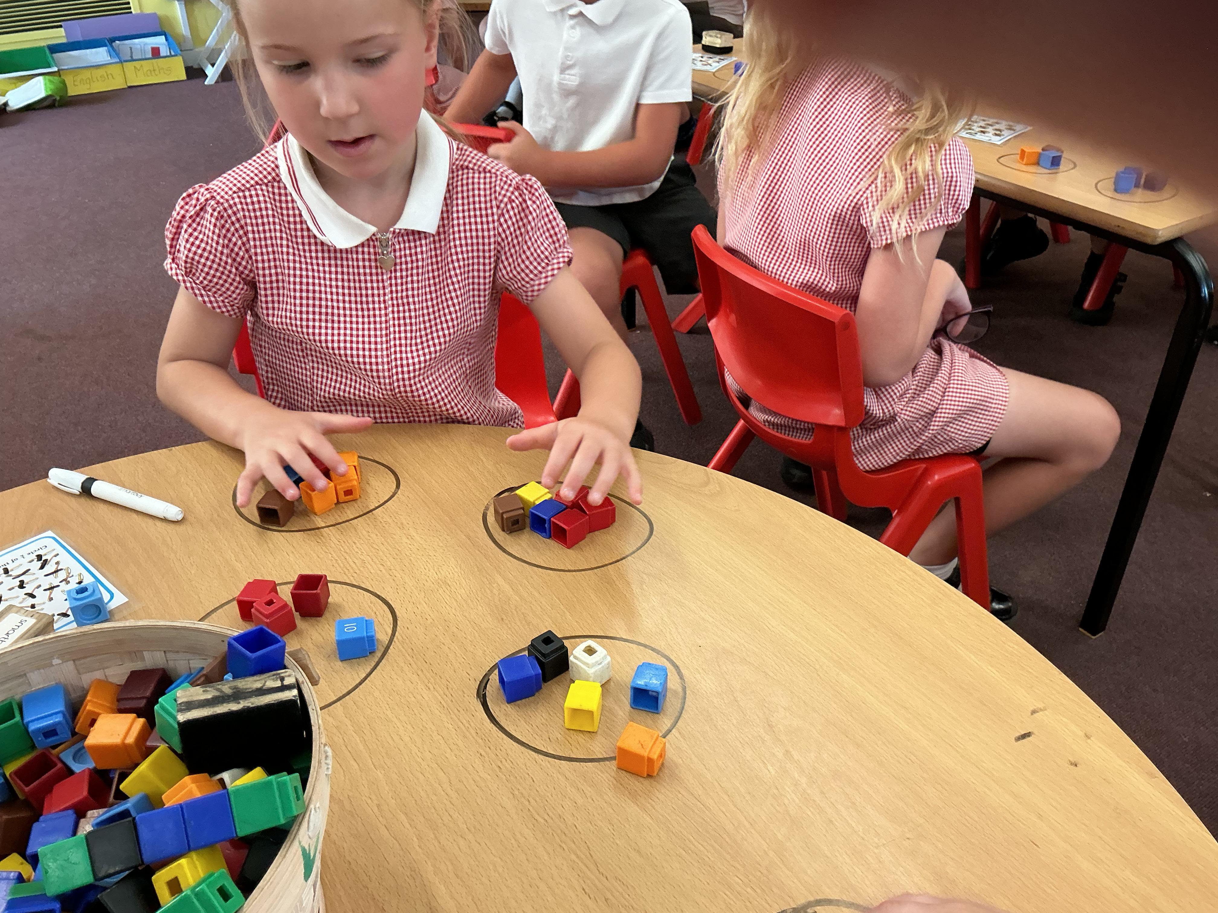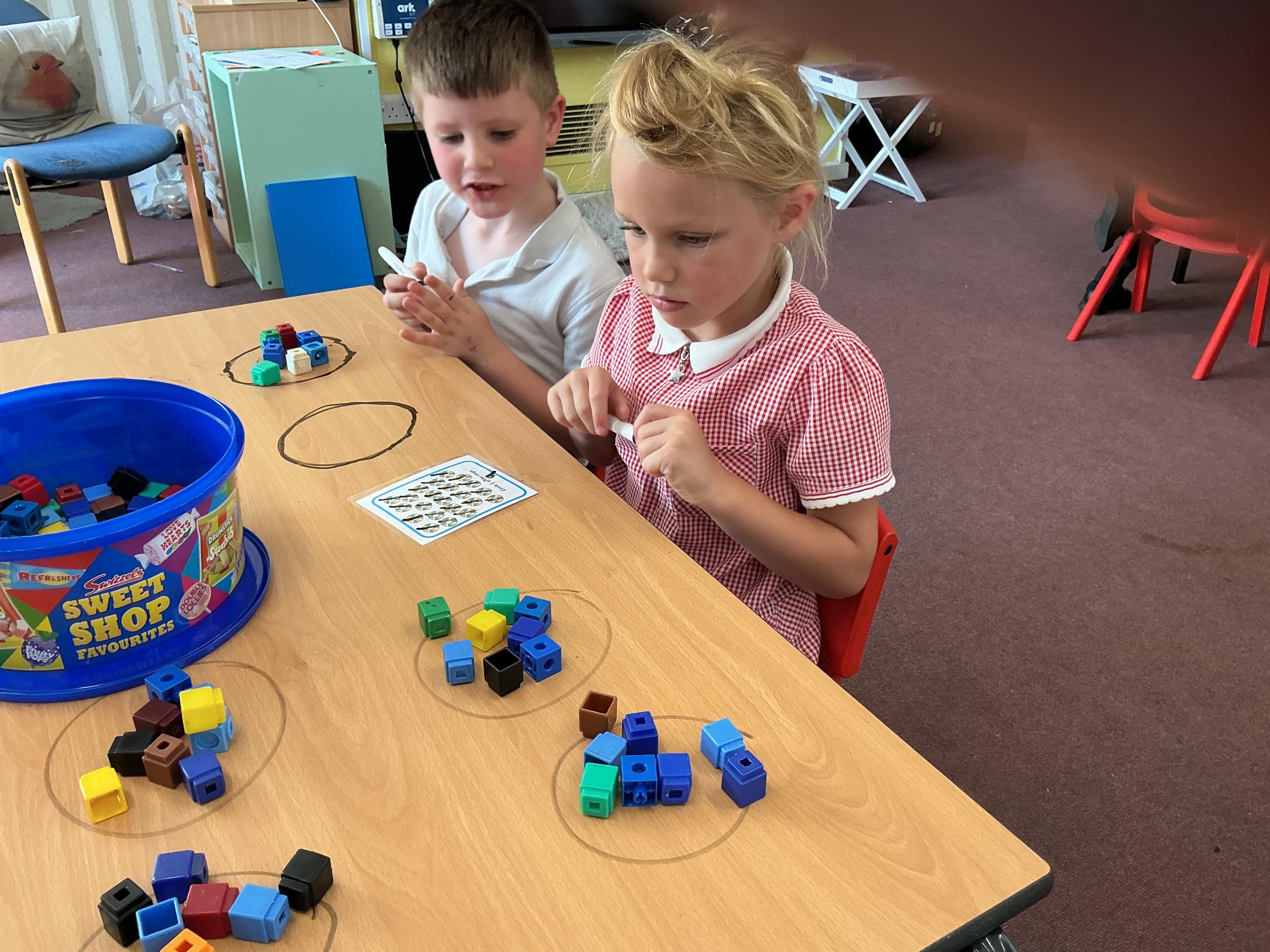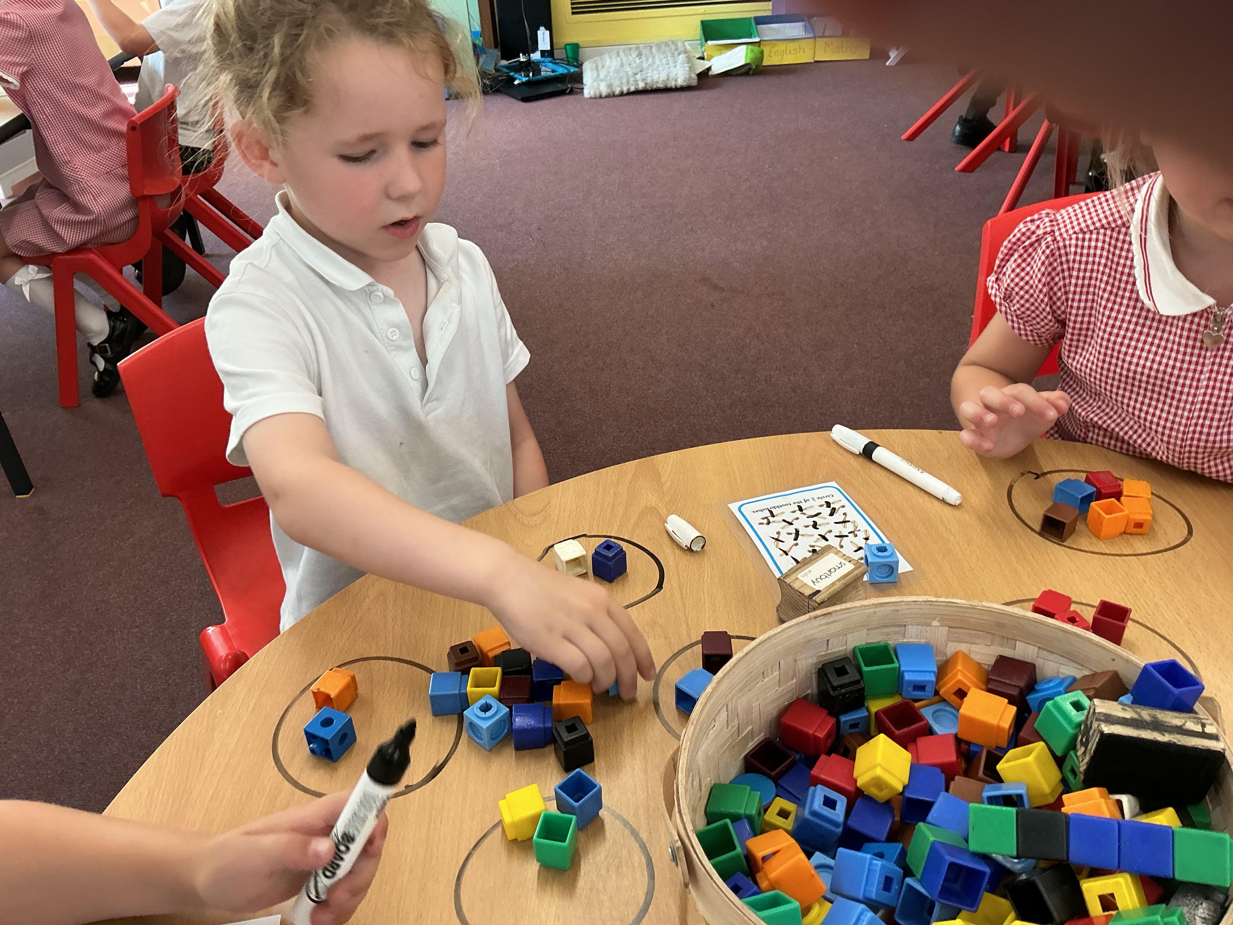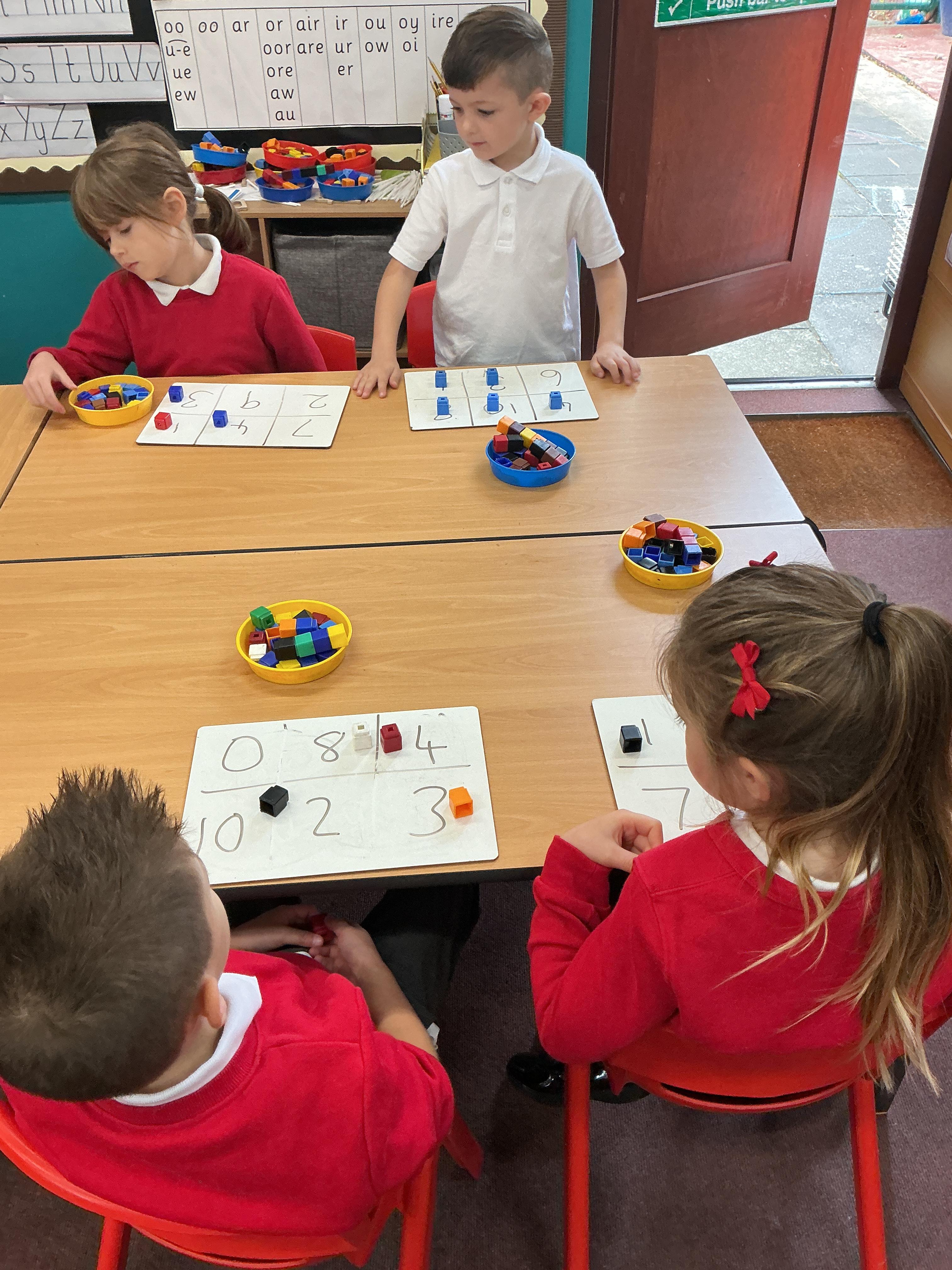 We have been using equipment to help us find halves and quarters of groups of objects. We even wrote on the tables to help us with our learning - luckily it all came off!